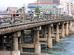 東海道五十三次の終着点「三条大橋」です。十返舎一九の東海道中膝栗毛の弥次さんと喜多さんの像もあります。三条大橋には、歴史のある擬宝珠が使われていますが、その一つに1864年7月8日新撰組が旅館池田屋に尊王攘夷派を襲撃した池田屋騒動のときの刀傷と云われているものがあります。
