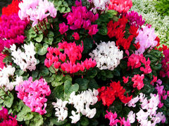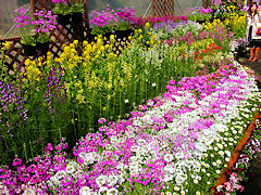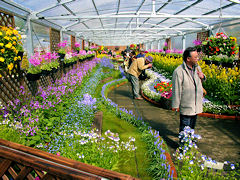 「花回廊-早春の草花展-」その2。ビニールハウスの中はこのようにレイアウトされています。早春の草花約70種200品種20,000株が植えられているそうです。