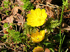 セツブンソウと福寿草が咲いていました。セツブンソウは、その名のとおり節分から一月以上経っているので元気がありません。池では水鳥が春の日を浴びて気持ちよさそうに泳いでいました。