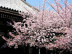 京都市上京区寺之内にある「本法寺(ほんぽうじ)」です。永享8年(1436年)に本阿弥清信が創建しましたが、1536年に焼失、天正18年(1590年)に豊臣秀吉によって現在地に移りました。現在の諸堂は、天明の大火(1788年)後の再建です。ここも山門を潜るとこのような桜が迎えてくれます。