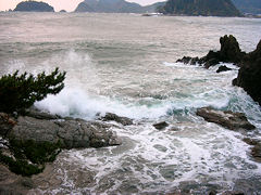 兵庫県の日本海側にある香住に行ってきました。その日は風があり海も荒れていました。その波を撮してみました。岩の割れ目に波が打ち寄せる度に噴水のように海水が吹き上げていました。