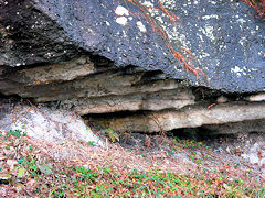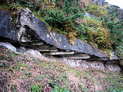 香住町下浜には、このような海岸線の風景が見られる対岸に、天然記念物に指定されている「漣痕化石(れんこんかせき)」がありました。これは、水流や波の作用によって水底にできた波状の模様(漣痕)の上に新しい土砂、泥が堆積して模様が地層面に残ったものです。このように保存状態がよいのは珍しく学術的価値は高いそうです。