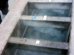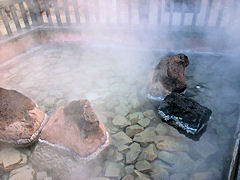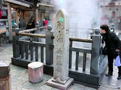 兵庫県にある湯村温泉の荒湯です。97度の湯が湧き出ています。このようにゆで卵を作るためのものが作られています。約15分でゆで卵が出来上がります。