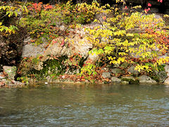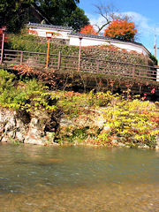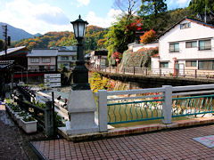 湯村温泉の荒湯の傍に足湯があります。目の前を流れる川水で湯を適温にして、このような対岸の風景を眺めながらノンビリと湯に足を入れていると、なかなか気持ちの良いものです。