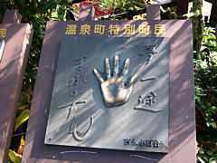 湯村温泉といえば、夢千代さんですよね。NHKのドラマで吉永小百合が演じて有名な芸者さんです。その銅像です。夢千代というより、吉永小百合の銅像ですね。傍に「夢一途」と書いたサイン入りの手形もありました。