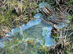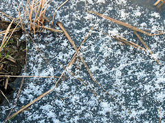 連日寒い日が続きますが、田圃の水溜まりにはこのように氷が張っていました。氷の上に雪が残っているところもあります。一段と寒さを感じさせます。電線には雀が囀っていましたが、「電線で雀が三羽止まってた それを猟師が鉄砲で撃ってサ・・・・」昔、電線音頭が流行っていたのをフト思い出しました。