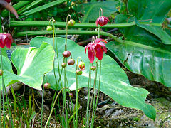 京都府立植物園・温室の植物その4です。左から「ベニヒモノキ」(西インド諸島)、「サラセニア」(アメリカ南東部)、「アルディシア」(インド)です。