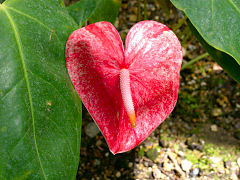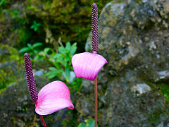 京都府立植物園・温室の植物その5です。左から「フィクス」、「アンスリウム(マーブル・レッド)」、「アンスリウム(紫タイプ)」です。
