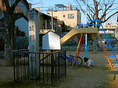 京都市南区にある羅城門祉です。平安京の中心朱雀大路の南端に作られた大門ですが、天元3年(980年)7月に暴風雨で倒壊してから放置され、平安京の荒廃により羅城門周辺の治安は悪化し、夜になれば誰も近づかない荒れたところになったようです。そのようなところから芥川龍之介の小説「羅生門」にあるような門に荒廃したようです。映画でも有名になり世界的に知られた羅城門ですが、今は礎石も無く小さな児童公園の中程に明治28年に建てた標石があるのみです。そんな歴史があるところを子供たちが遊んでいました。