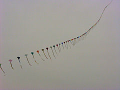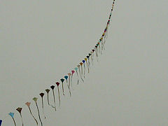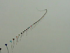 木津川の堤防でこのような連凧を揚げている年配の方が居られました。その数は500ということでした。凧揚げには絶好の風が吹いていましたが、青空でなかったのが残念。 (動 画)