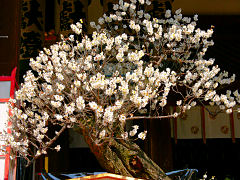 大阪天満宮です。初めて行きましたが、思っていたより小さな境内でした。本殿左右に盆梅がありましたが、白梅は「あけぼの」と命名されていて樹齢110年、紅梅は「唐衣」で樹齢280年だそうです。