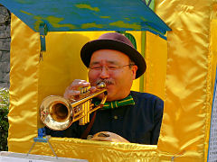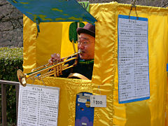 ジュークボックスというものを見かけなくなって久しくなりますが、「人間ジュークボックス」というものがありました。一曲200円で130曲ほどのレパートリー中から、トランペットとタンバリンで演奏してくれます。ユニークでユーモアたっぷりな人でした。このような商売があるのは大阪らしいですね。(動 画1)(動 画2)