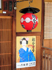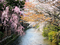 花街の祇園を東から西へ流れている白川です。この川に沿って枝垂れ桜が植えられています。吉井勇の『かにかくに 祇園は恋し 寝るときも 枕の下を 水の流るる』の歌碑もあります。お茶屋には都をどりの提灯とポスターがありました。