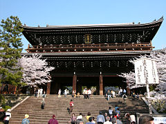 浄土宗総本山である「知恩院」の三門です。元和7年(1621)に第二代将軍徳川秀忠が建立した高さ24m幅50mのわが国現存の木造建築として最大の楼門です。国宝となっています。その三門の正面に掲げてある「華頂山」という額を撮してみました。三門を抜けると急な階段が続く「男坂」があります。