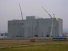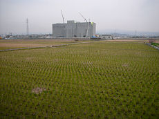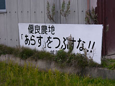夏の終わり頃から通らなかったら、田圃の中に何ができるのかビルの建設が行われています。このように段々と田畑が無くなっていくようです。農機具の倉庫にこのような看板が置いてありました。