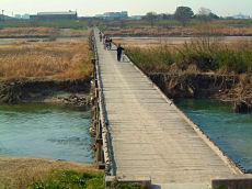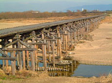 (「水辺の道」④ 2007. 1.15 の続き) お馴染みの時代劇になくてはならない流れ橋です。橋のたもとに石標があります。「流れ橋(上津屋橋)」と書かれていますが、裏側にはこのように「寄贈 藤田まこと」とあります。そういえば、よく中村主水が渡るのをよく見ました。越後の縮緬問屋のご隠居様一行もよく渡っています。