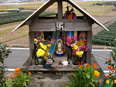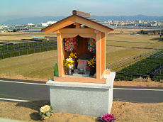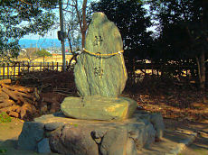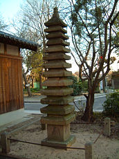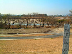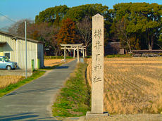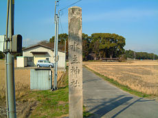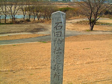 (「水辺の道」⑤ 2007. 1.17 の続き) 木津川の堤防に「石田神社遙拝所」と書かれた石碑があります。石田神社は流れ橋を渡ったところにあり、木津川の氾濫による疫病を防ぐために信仰されました。この石田神社の十三重の塔は形状から南北朝時代のものと言われています。