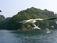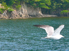 遊覧船に乗るとカモメが餌を求めてついてきます。よく馴れたもので直接手から餌を取っていきます。トンビも同じようについてきます。