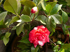 例年なら、もっと早く咲いている我が家の鉢植えの椿がやっと咲き出しました。今年のような暖冬なら早く咲き出すのかと思いきや、そうでもなさそうです。