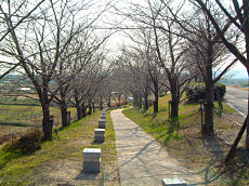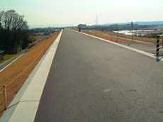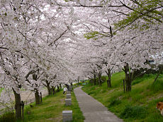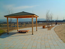 (「水辺の道」⑦ 2007. 1.29 の続き) 木津川を寺田の方へ進むと平成元年に「ふるさと創生事業」で小学生のアイデアにより「緑と水辺のやすらぎ回廊」として桜並木が作られています。春になればこのような春の道(写真中央)となります。東屋のある地区はまだ工事中のようです。