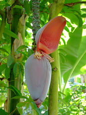 バナナは、食べる房の先に花が咲くと思っていたのですが、それ以外に房から下の方にこのような大きな花が咲きます。これは初めて見ました。