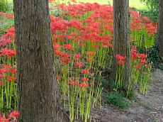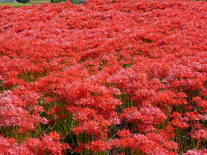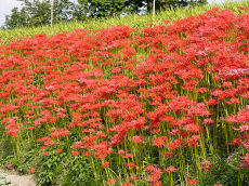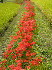 奈良県御所市にある「葛城古道」の九品寺周辺に咲いていた彼岸花です。一面を真っ赤にして咲いていました。これほど群生して咲いている彼岸花は初めてでした。昔ならどこにでもあった風景だったでしょう。