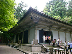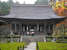 中尊寺の金堂です。金堂は覆堂に保護されていますが、右は新覆堂建設の際に現在地に移築された、旧覆堂です。金色堂建立から164年後の正応元年(1288年)に、鎌倉幕府が風雪から護る為に建造したということだそうです。