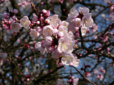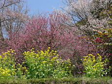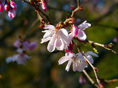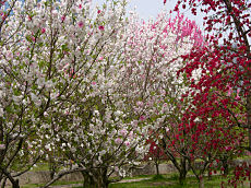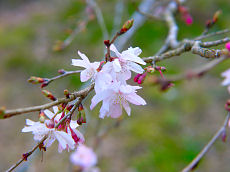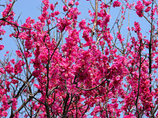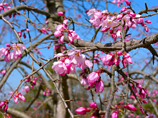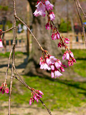 京都府立植物園で撮しました。ソメイヨシノは、まだ蕾でしたが、このように満開になっている木もありました。左から、「トウカイザクラ」、「アンズ」、「カラミザクラ」です。