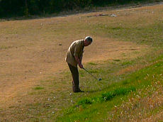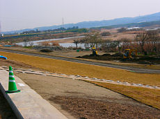 流れ橋の城陽市側の土手は、現在工事が行われて仕上げに、このように野芝が植えられています。自然がいっぱいの木津川の堤防が人工の堤防に変わるのは残念です。工事が行われていないところでは、ゴルフの練習をしている人がいました。
