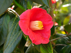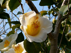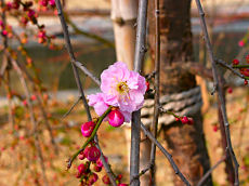 流れ橋の付近で咲いていた紅白の椿と枝垂れ梅です。