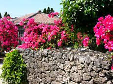 八重山諸島の竹富島です。竹富島の暴風避けの石垣からブーゲンビリアの赤い花が印象的でした。観光は水牛車に乗ってノンビリとしたものでした。