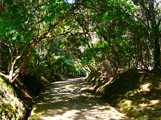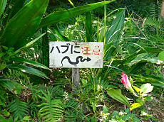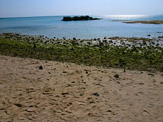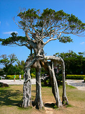 竹富島です。左から「星の砂浜」で星の砂を採取することが出来ます。道端の草むらに「ハブに注意」という立て札が所々に立っています。小学校でも道の端は歩かないで真ん中を歩くように指導しているとか。この木を潜ると幸せになれると言われています。