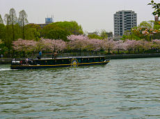 大阪・天満橋から見る大川(旧淀川)です。両側は桜並木が続いていて、観光の水上バスが運行されています。桜並木の向こうに、高層ビルが見えるところが京都と違うところです。