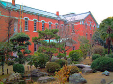 京都大学その5です。左から木造の旧演習林の建物。1978年に発掘調査したところ12世紀終わり頃の火葬塚と判明した。赤レンガの工学部・土木工学教室。