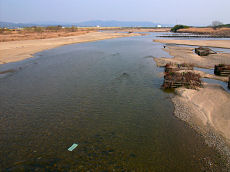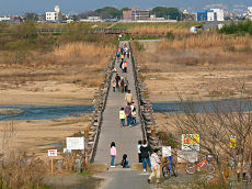 流れ橋です。焼けたところの補修をやっと終わったようです。たばこ?花火?の不始末で橋を焦がすようなことはないように願いたいものです。暖かくなったので沢山の人が渡っていました。