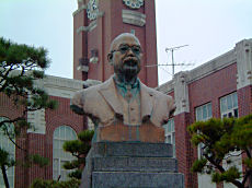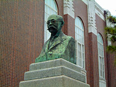 京都大学です。シンボルの時計台と第7代総長の荒木寅三郎(大正4年就任)、第8代総長新城新蔵(昭和4年就任)の銅像がありました。