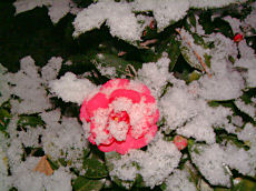 今日も寒い一日で夕方に雪が降りました。一面うっすらと雪化粧です。赤色のツバキも白く薄化粧していました。