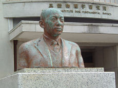 京都大学その3です。この建物は朝永振一郎や福井謙一が学生の頃研究したところなので、ノーベル賞の館と呼ばれています。福井謙一がノーベル化学賞受賞記念碑と日本人初受賞した湯川秀樹の銅像です。