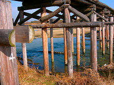 通称「流れ橋」と呼ばれている上津屋橋(こうづやばし)です。京都府南部を流れる木津川に架けられた全長356.5m、幅3.3mの日本で一番長い木造橋です。大雨で水位が上がれば橋桁が流れる独特の構造を持つことから「木津川の流れ橋」と呼ばれ、時代劇のロケーションによく使われています。昭和28年3月に架設されて以来平成9年7月までに15回流れています。