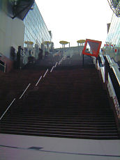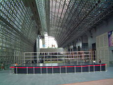 JR京都駅です。この大階段では毎年階段駆け上がり競争があったり、ミニコンサートが開かれます。右の写真は大階段からコンサートになる舞台を見たところです。大階段が観客席になります。