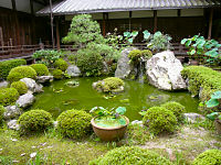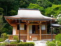 滋賀県大津市にある西国33カ所の第12番札所「岩間寺」です。本堂右側には小さな池がありますが、芭蕉が「古池や蛙飛び込む水の音」を詠んだと伝えられています。