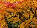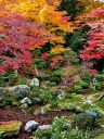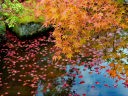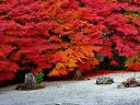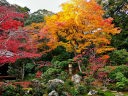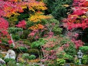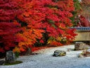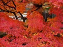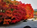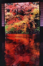 秋の紅葉の頃は一面真っ赤に染まり、黒塗りの床にモミジが映り「床もみじ」として有名です。この床もみじは撮影禁止になっていますので、左の写真は実相院のホームページからコピーさせてもらいました。 |
