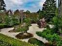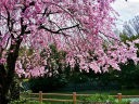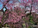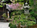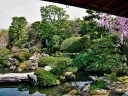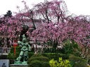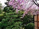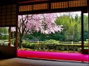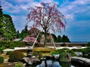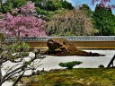 白砂の石庭に紅枝垂れ桜が咲き、遠くに東山連峰が霞んで見える静かな寺院です。