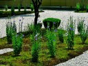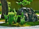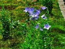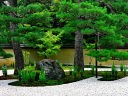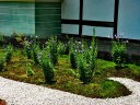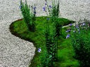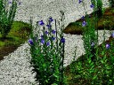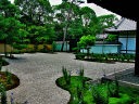 この地は、紫式部の邸宅址であることから「源氏の庭」が昭和40年に出来ました。白砂に苔がありそして桔梗が彩りを添えています。