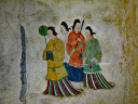 壁画が、石室の東西北壁と天井の漆喰の上に、極彩色で描かれています。西壁の女子群像は特に有名で、「飛鳥美人」として親しまれています。