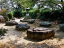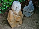 帰りに、吉備姫王墓(きびつひめおおきみのはか)の墓域にある「猿石(さるいし)」を見に行きました。江戸時代に近くの水田から発見されたものをここに移されたものです。飛鳥にある石造物には、亀石、鬼の俎、鬼の雪隠などあるが、この猿石はもっともユニークな表情をしています。 |