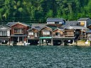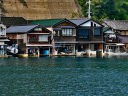 京都府与謝郡伊根町には、伊根湾に沿って約230軒の1階が船のガレージ、2階が居間といった独特の建物である舟屋があります。海辺に平行して建っているので、海に浮かんでいるように見えます。