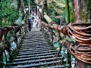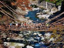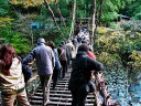 祖谷のかずら橋は、三大奇橋の一つに挙げられています。山梨県「猿橋」、山口県岩国の「錦帯橋」と、このかずら橋か栃木県日光の「神橋」が三大奇橋と言われるようです。国の重要有形民俗文化財に指定されているかずら橋は、自生するシラクチカズラで編まれた吊り橋で、全長45m、幅2m、水面からの高さ14mとなっています。多くの人が渡るのでシラクチカズラと目立たないように色塗りされたワイヤーロープで補強されています。