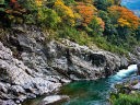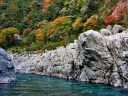 大歩危は、結晶片岩が水蝕されてできた吉野川中流域にある溪谷です。遊覧船が運航していてこの渓谷美を川面から眺めることができます。(約30分:1500円) 大歩危の下流約3kmが小歩危になっています。名のように大歩危よりややスモールになっていますが、岩の美しさは大歩危に勝るとも劣らない魅力があります。 |